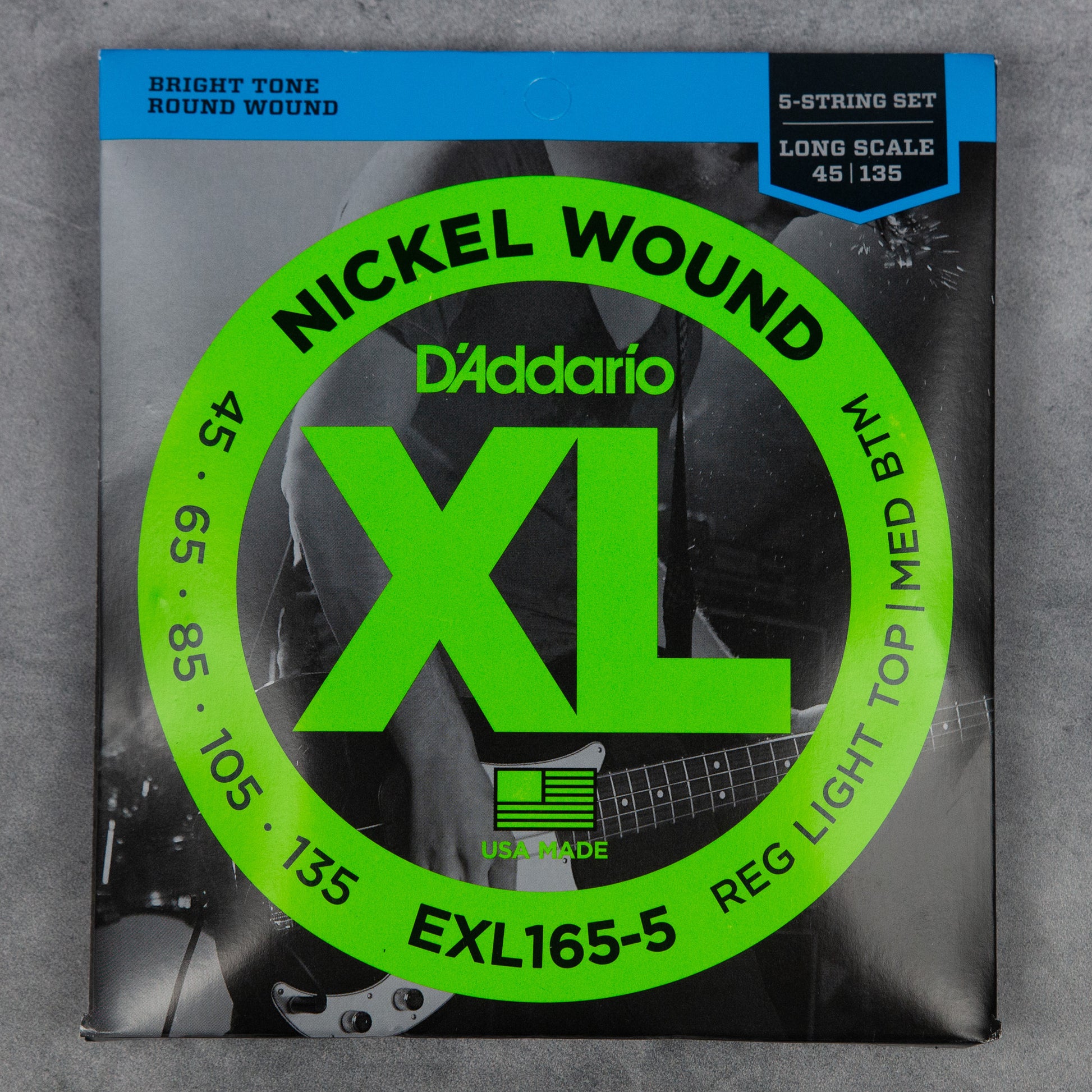 XL Nickel are the industry standard in electric bass strings. With their clear fundamentals, booming tight lows, and reliable D’Addario construction, they’re trusted by players everywhere to handle any performance. XL Nickel bass strings are made with a high carbon steel core and wound with nickel-plated steel wrap wire, for consistently bright tone and smooth playability, great for a wide variety of bass styles. Made for 5-string basses, this 45-135 Regular Light Top/Medium Bottom gauge set has a great mix of tighter low-end with a comfortably balanced, bright top.
