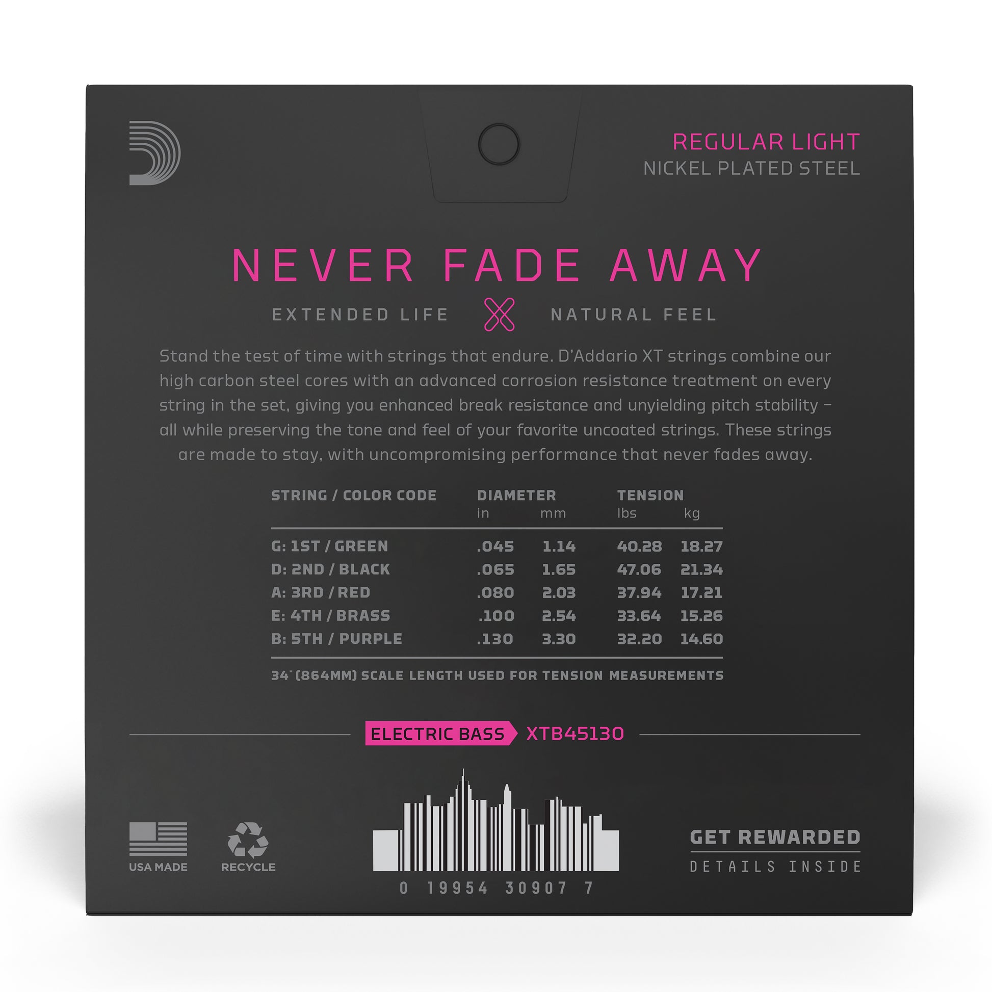 XT Nickel bass strings offer enhanced strength, better pitch stability, and longer-lasting performance than standard bass guitar strings. The XT coating provides advanced corrosion resistance, while still retaining the bright tone and natural feel of an uncoated bass string. Beneath the coating, XT Nickel bass guitar strings are constructed with a NY Steel core, nickel-plated steel wrap wire, and Fusion Twist technology, resulting in added resilience and tonal versatility, excellent for a wide range of musical styles. Made for 5-string basses, this 45-130 Regular Light gauge set takes our most popular gauge and adds a low B-string.