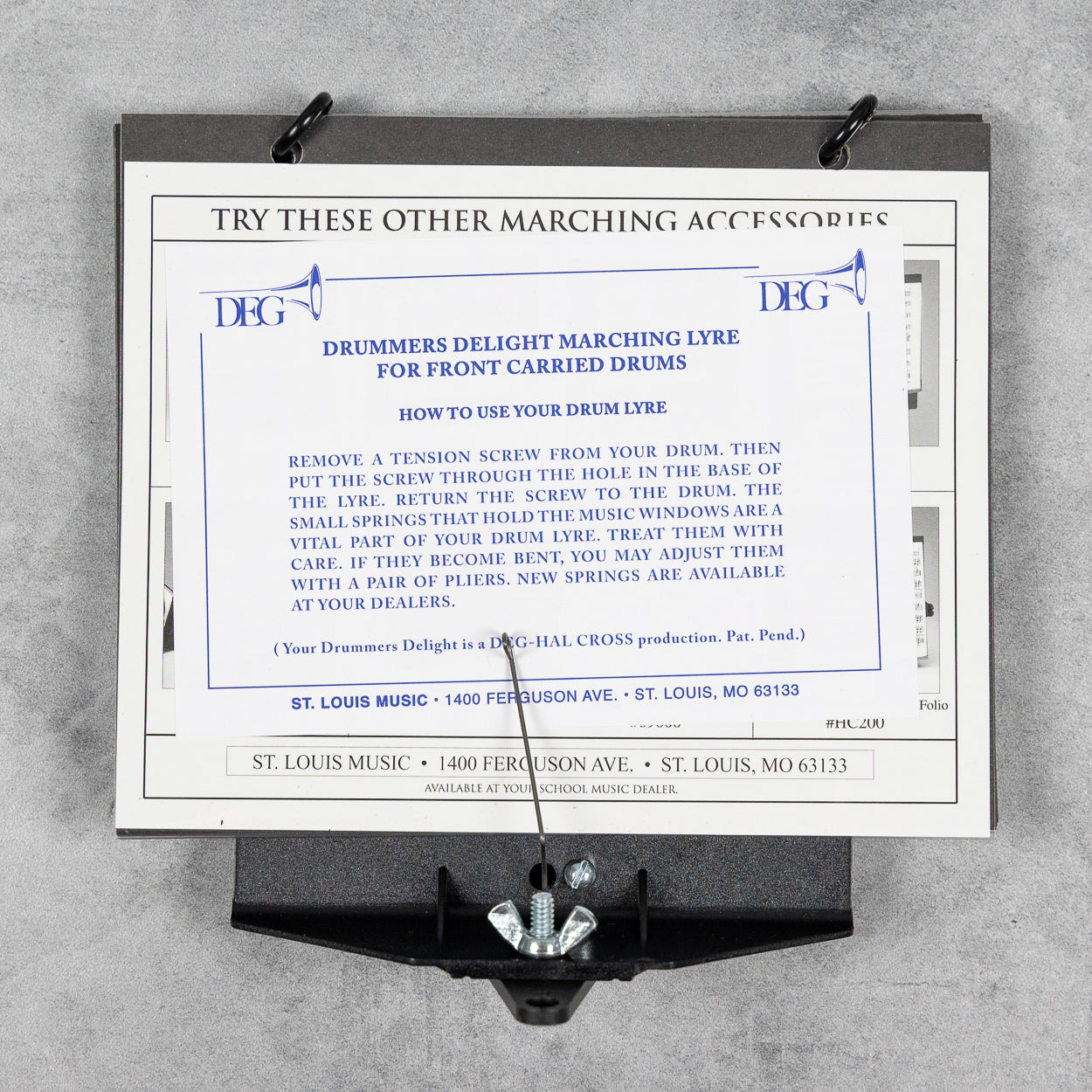 Known affectionately as the 'Drummer's Delight,' the DEG Marching Snare Drum Lyre is designed for carried drums and is used by marching drummers all over the world.