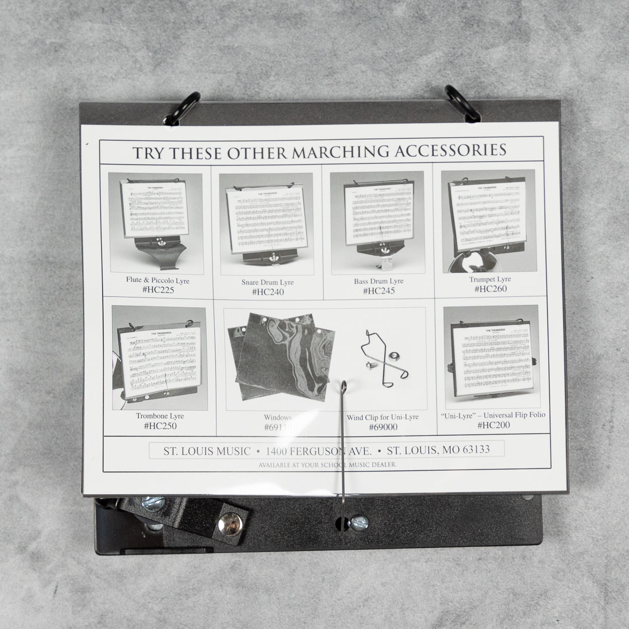 The DEG trombone lyre clamps on any trombone bell rim and holds your music confidently in place, even in the most demanding conditions. The clamp is made of a slip-resistant, non-scratching material that will not harm your instrument.