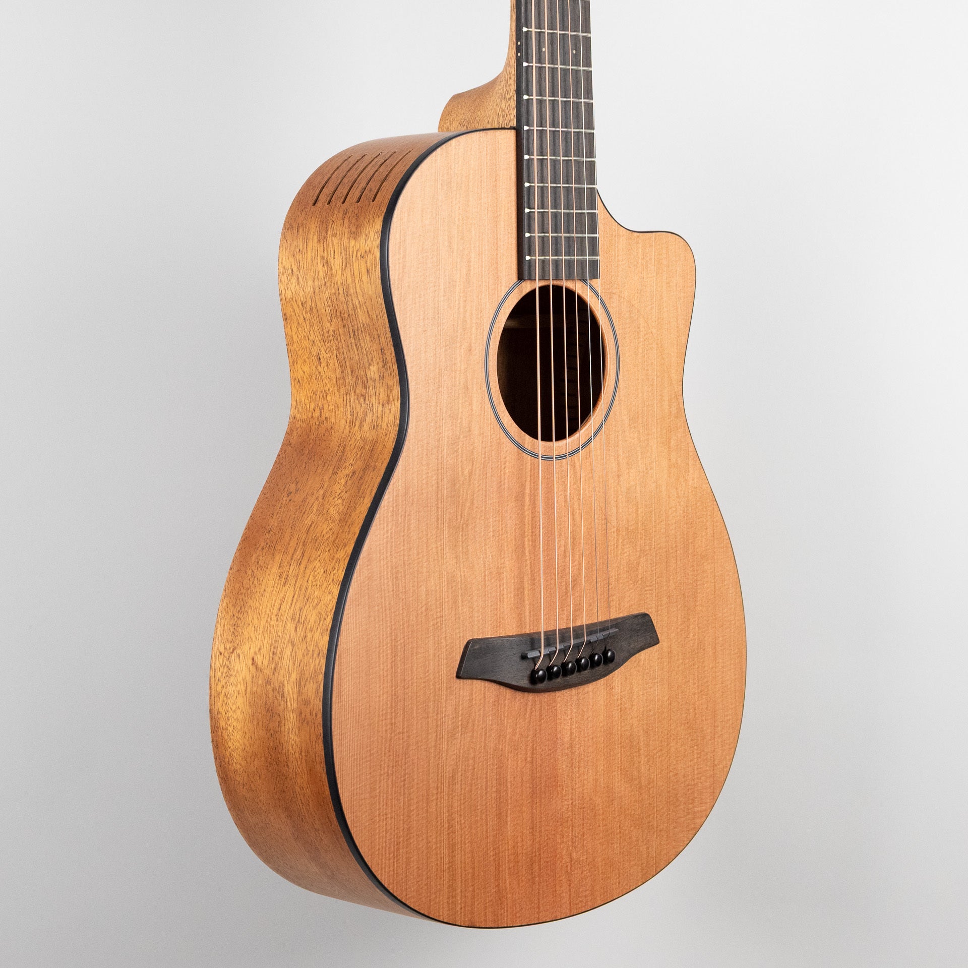- Short-scale, all-solid wood acoustic travel guitar
