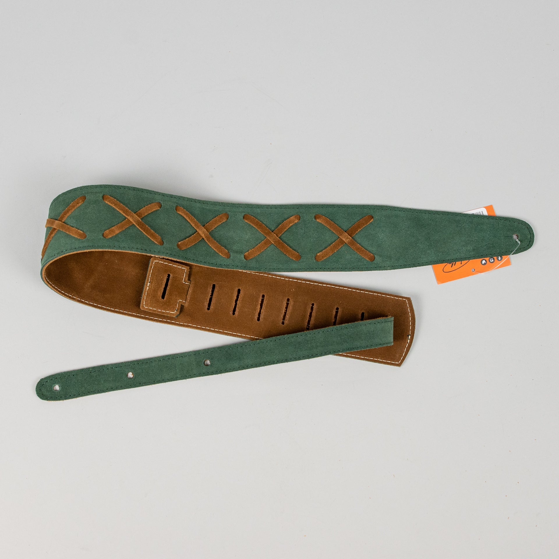 2.5" wide Henry Heller Capri suede with a decorative David Gilmour style leather X's design with a Henry Heller flat sewn pick pocket on the underside. Adjusts to a max length of 58". Small Batch & handmade.