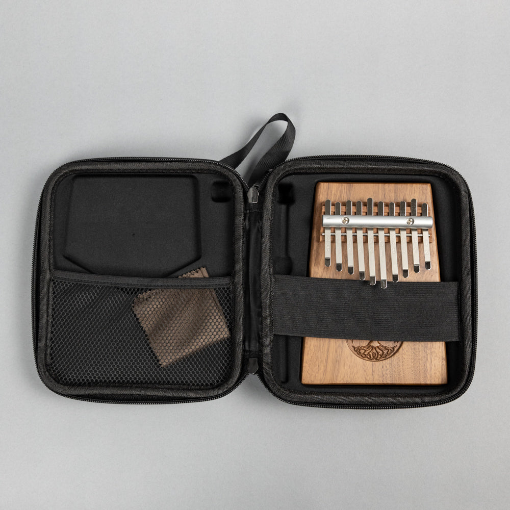 This kalimba comes with a protective case that's great for traveling. Also included is a tuning hammer to make adjustments as needed (the kalimba comes pre-tuned) as well as a microfiber cloth for cleaning.