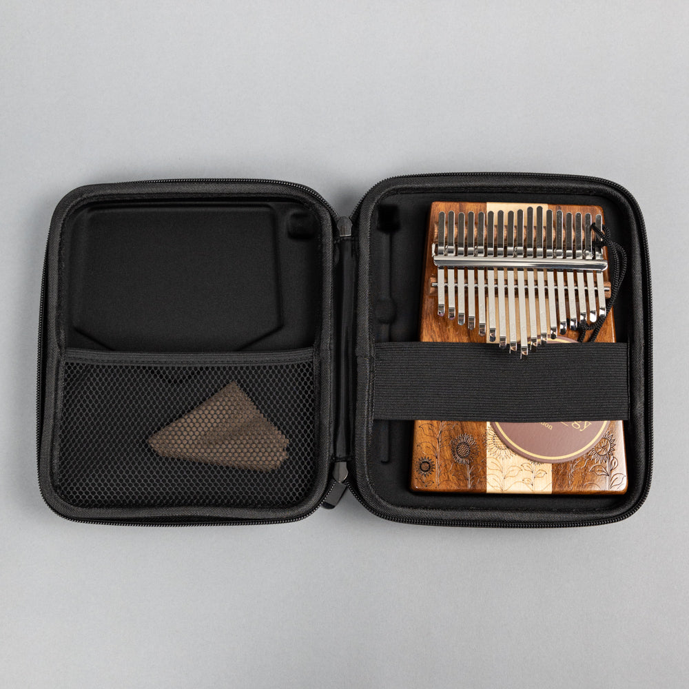The Kalimba comes with a case so you can protect it from scratches and other damage. To remove stains from your Kalimba and to keep it safe afterward, a microfiber cloth and a linen bag are also included. Besides that, there is also a tuning hammer in case you want to retune your Kalimba.
