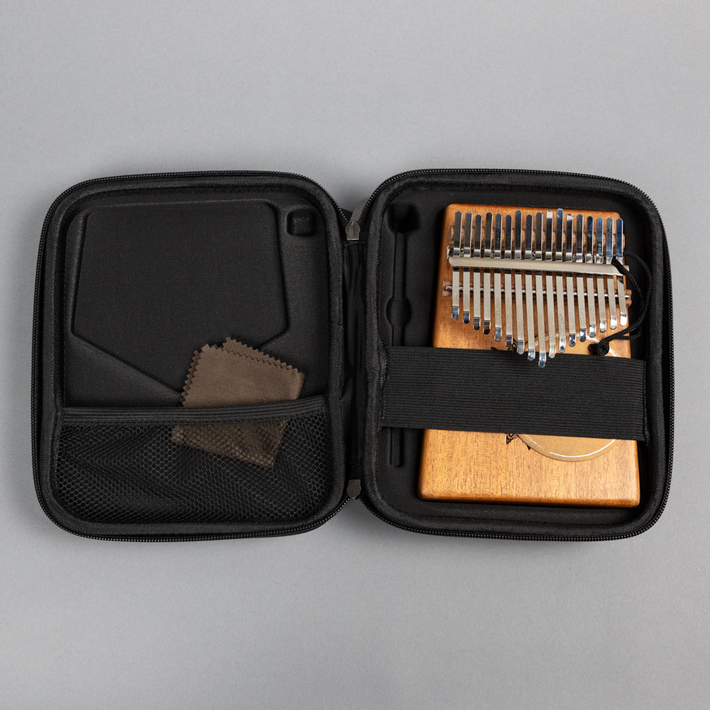 The Kalimba comes with a case so you can protect it from scratches and other damage. To remove stains from your Kalimba and to keep it safe afterward, a microfiber cloth and a linen bag are also included. Besides that, there is also a tuning hammer in case you want to retune your Kalimba.