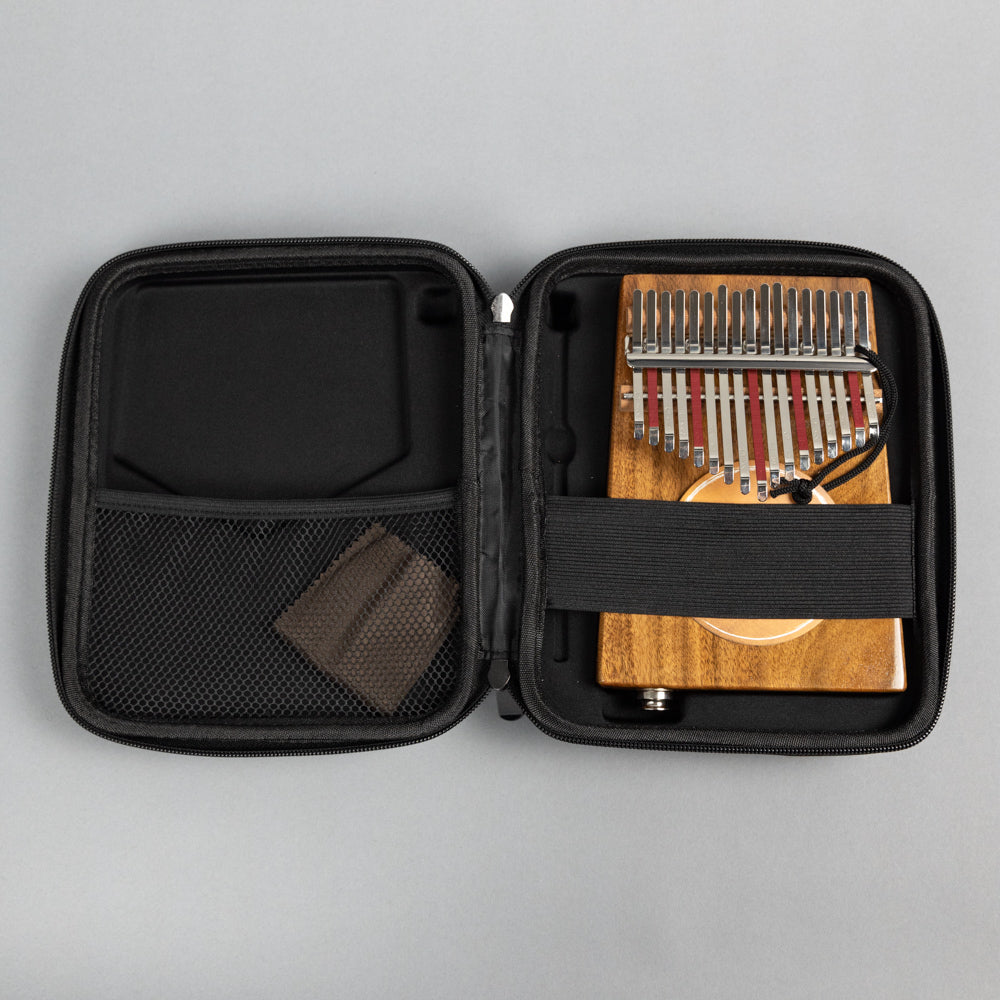This kalimba comes with a protective case that's great for traveling. Also included is a tuning hammer to make adjustments as needed (the kalimba comes pre-tuned). Finally, it also comes with a microfiber cloth for cleaning and a linen storage bag.