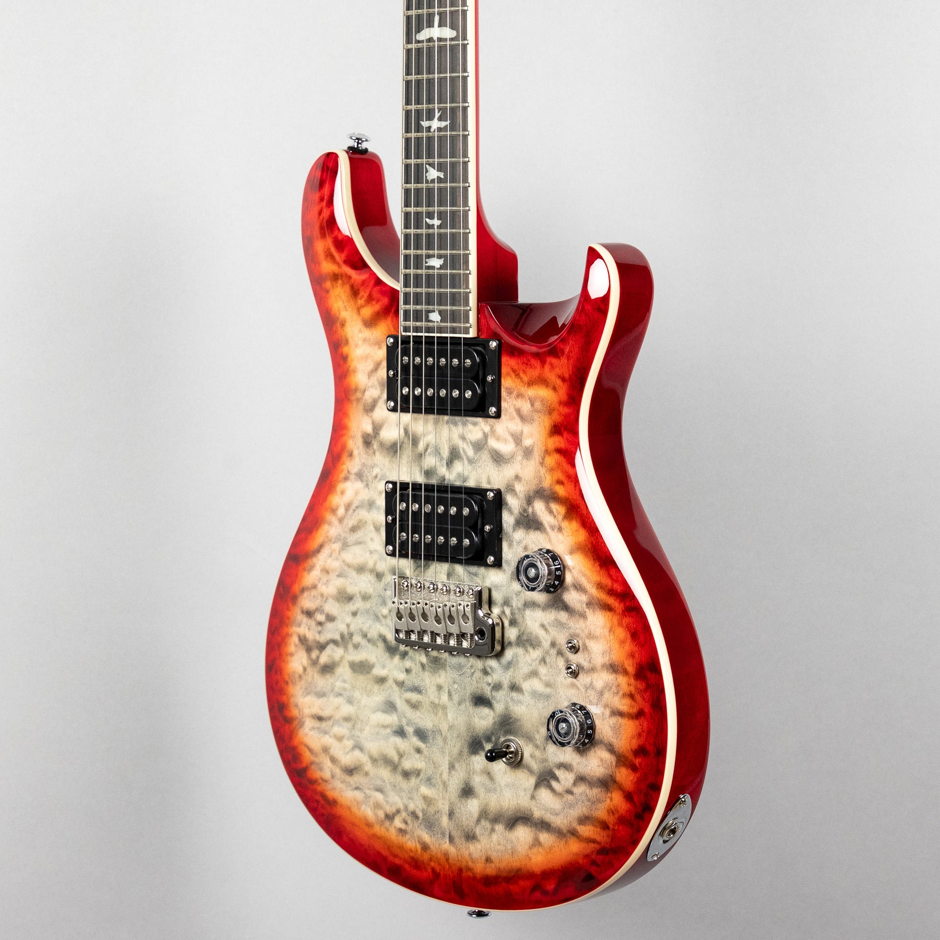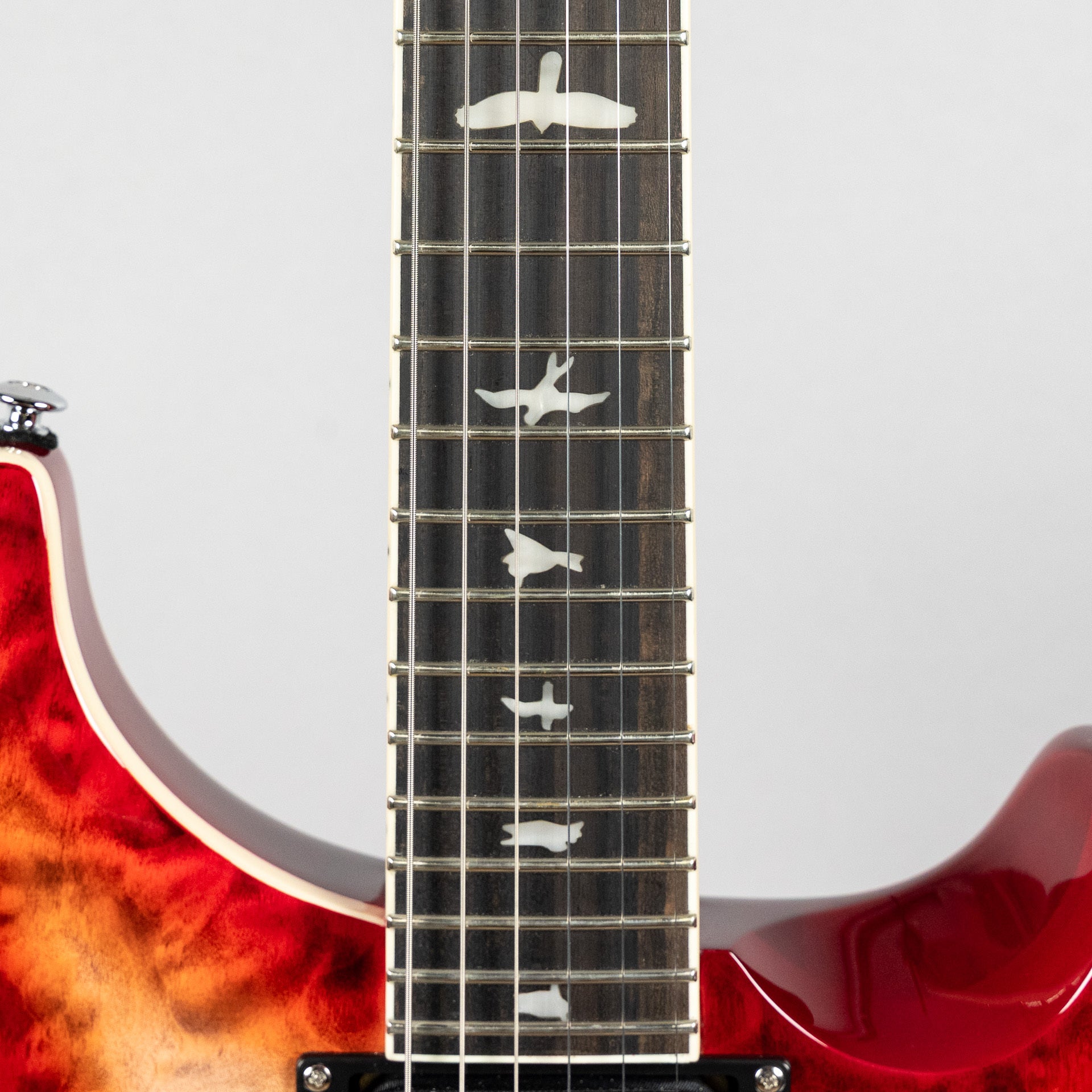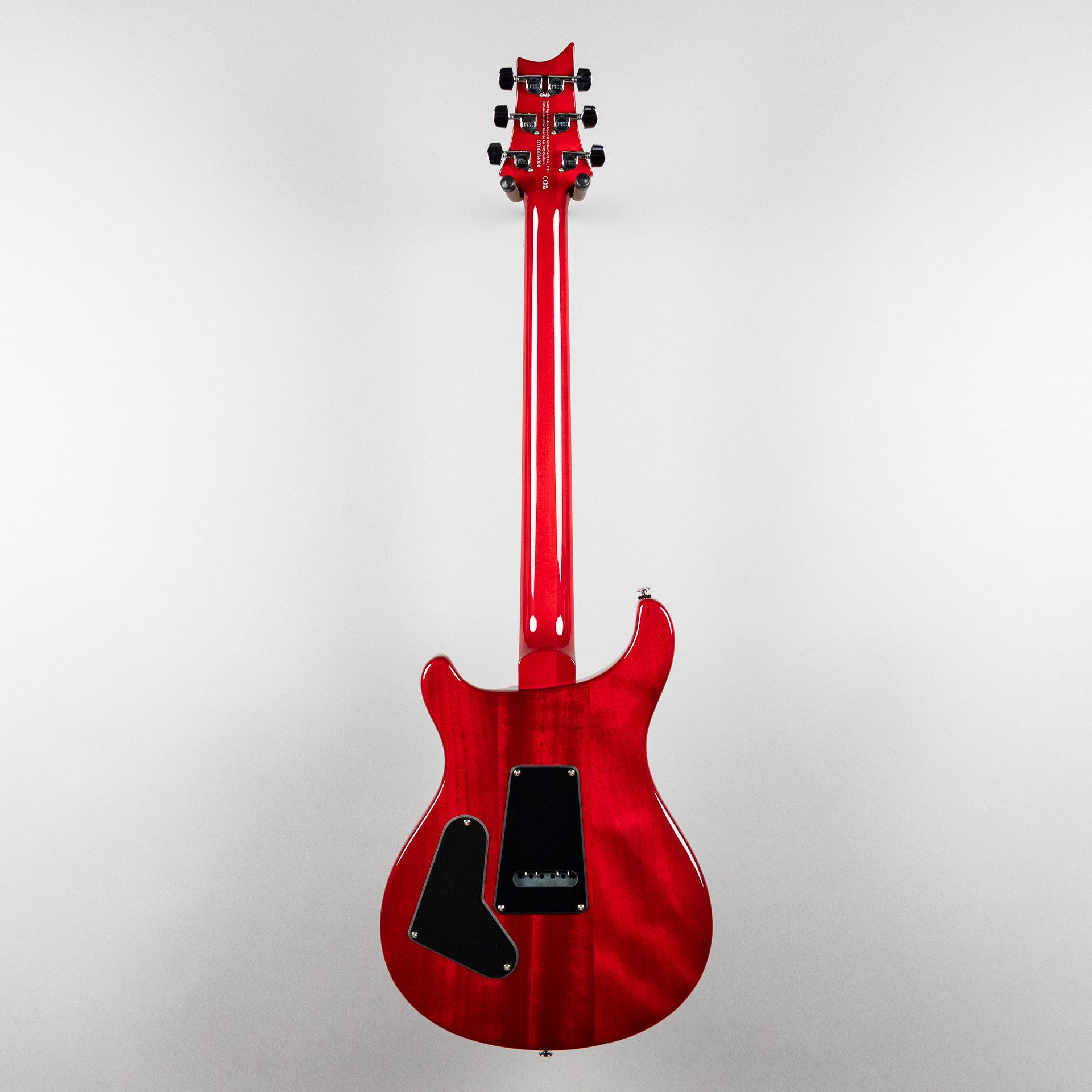 Classic design elements include a maple top, mahogany back, ebony fretboard, 24 frets, 25” scale length, bird inlays, dual humbuckers, signature headstock logo, and PRS patented tremolo.