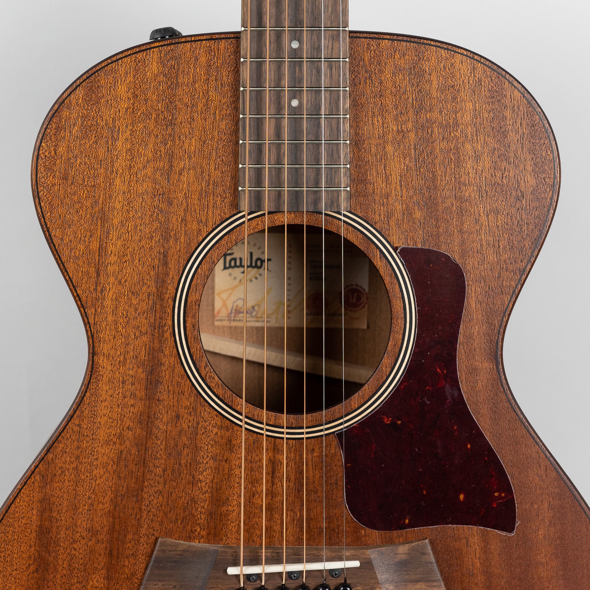 The AD22e offers players all the warm, seasoned tone, workmanlike style and exceptional value of the American Dream Series in a compact, accommodating Grand Concert frame. Featuring all-solid-wood construction and Taylor's tone-enhancing V-Class bracing, this model’s mahogany top pairs with sapele back and sides for a rich response with a bold midrange character and clear, pristine highs. The Grand Concert’s 24-?” scale length makes for a relaxed, slinky feel that will please fingerstylists and traditional pickers alike, while the hardwood top helps to even out the attack for a more balanced sound all the way down the neck. Chamfered body edges provide an even more intimate feel, while the ultra-thin matte finish preserves the guitar’s performance-forward aesthetic. Other visual details include 4mm dot fretboard inlays in Italian acrylic, black top purfling, a faux-tortoiseshell pickguard and a single-ring rosette. The non-cutaway AD22e includes our ES2 acoustic pickup and ships with a lightweight, durable AeroCase.