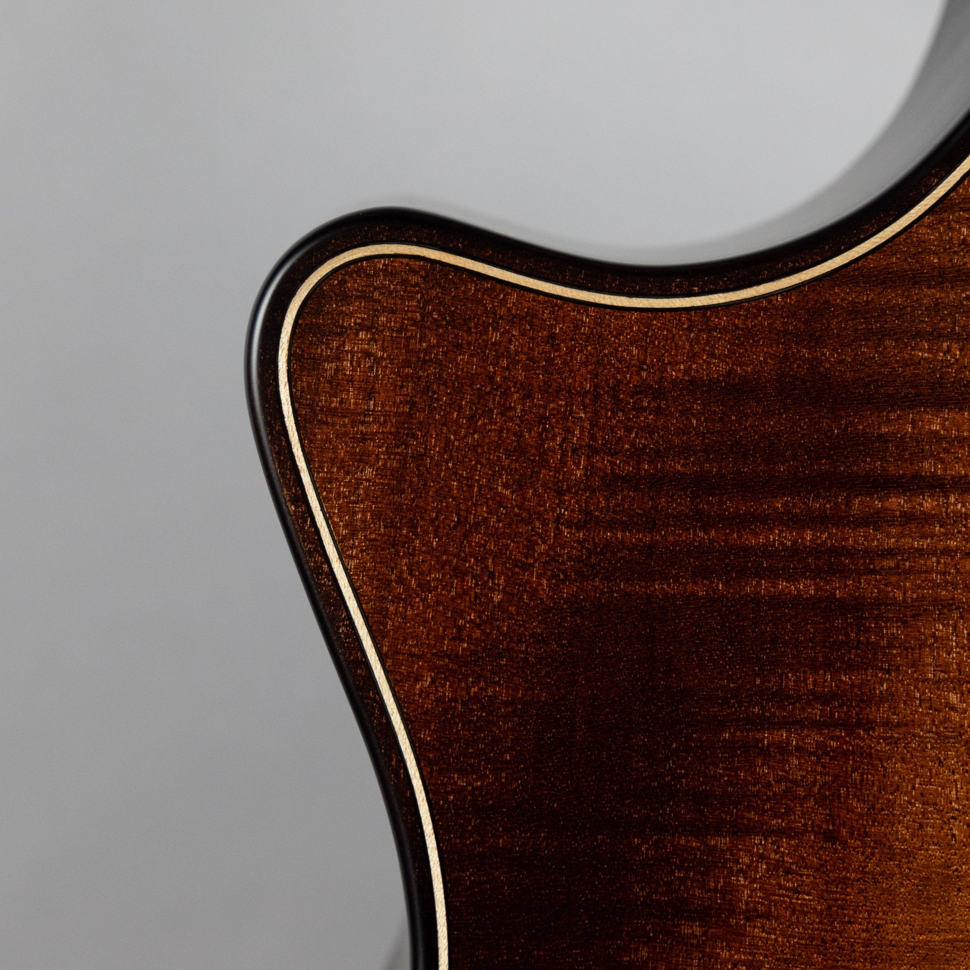 Beveled Cutaway: Taylor'sbeveled cutaway design provides a more player-friendly feel for guitarists who utilize every inch of the fretboard. It features a compound design with a smoothened edge along the corner of the body between the end of the cutaway and the neck heel, providing a more comfortable feel for the fretting hand.