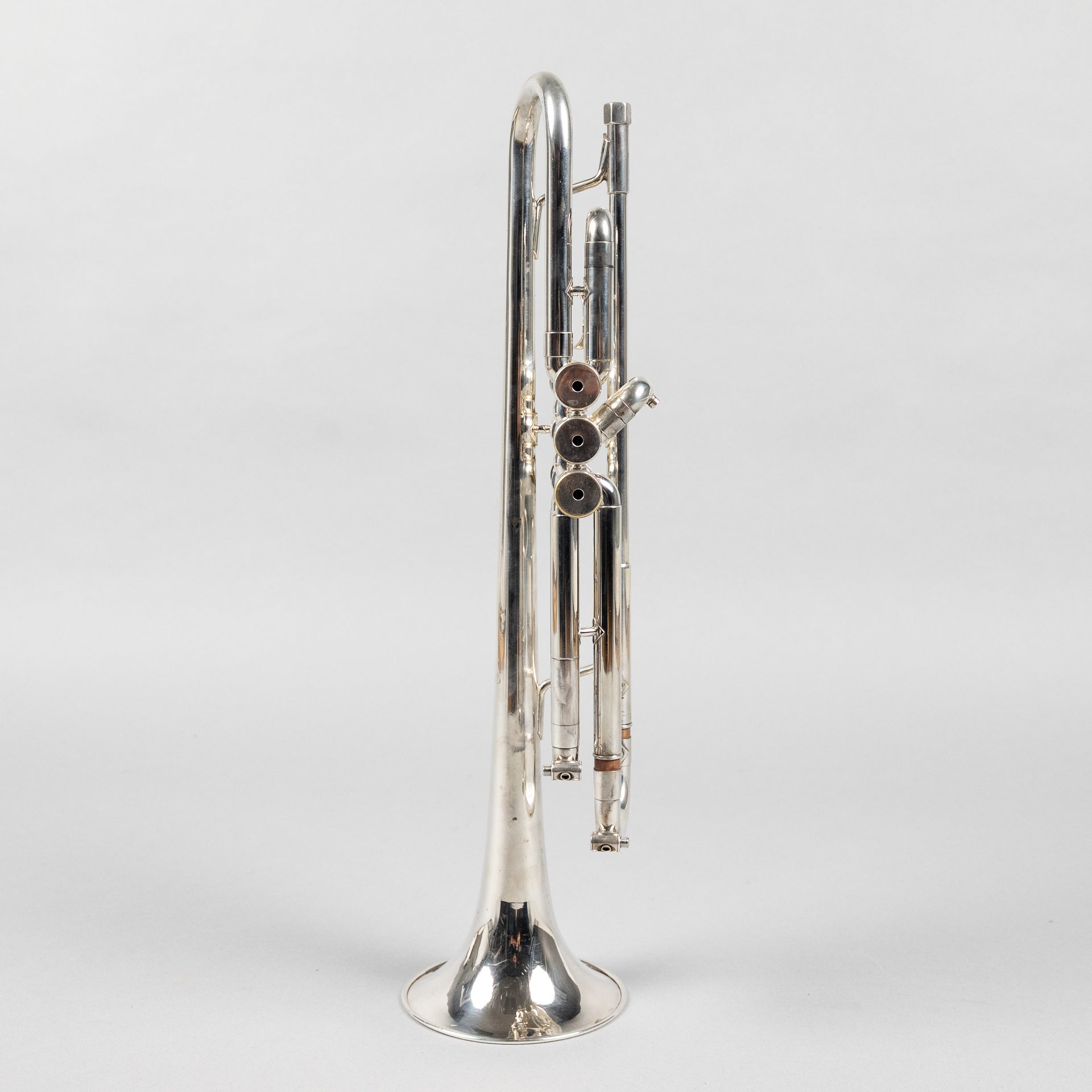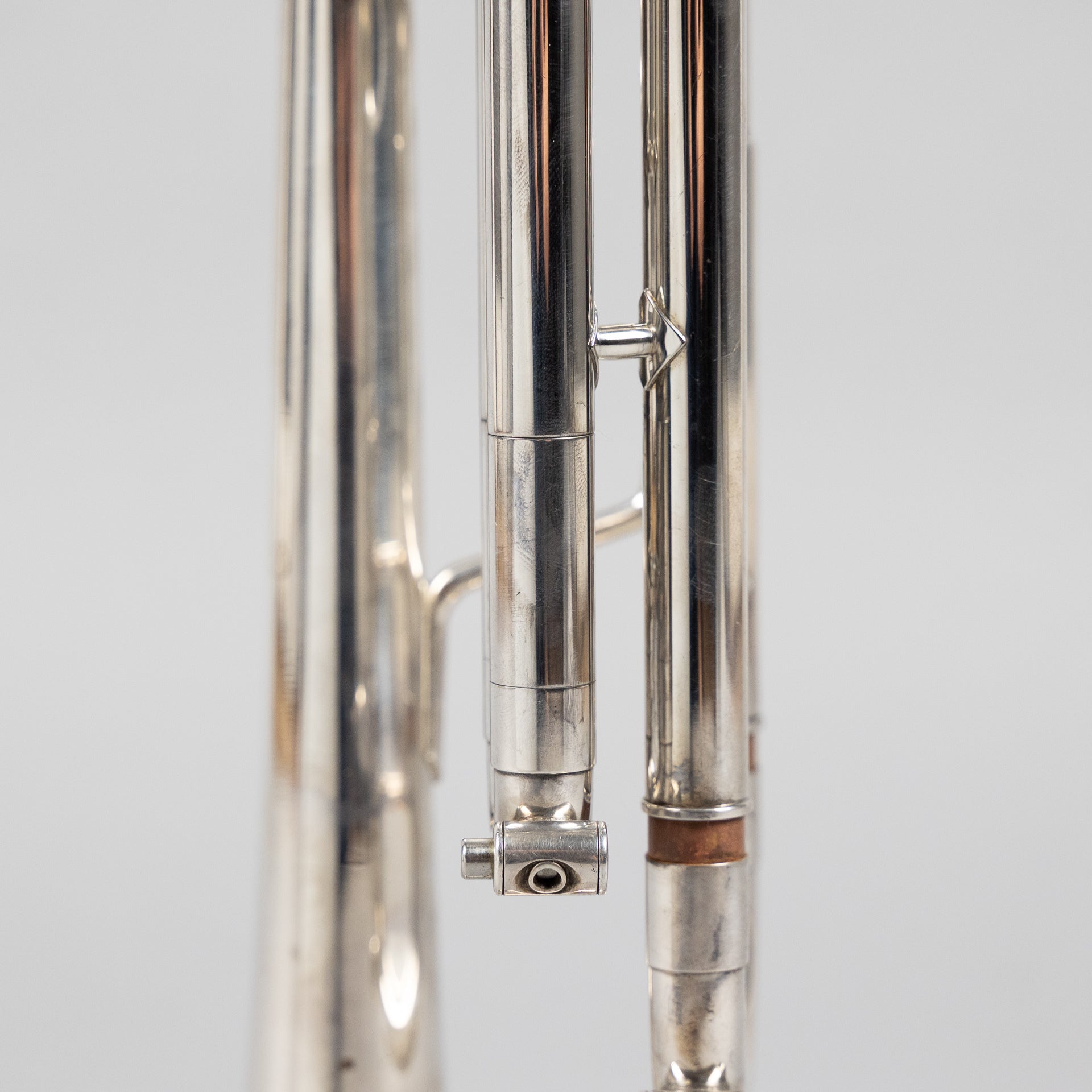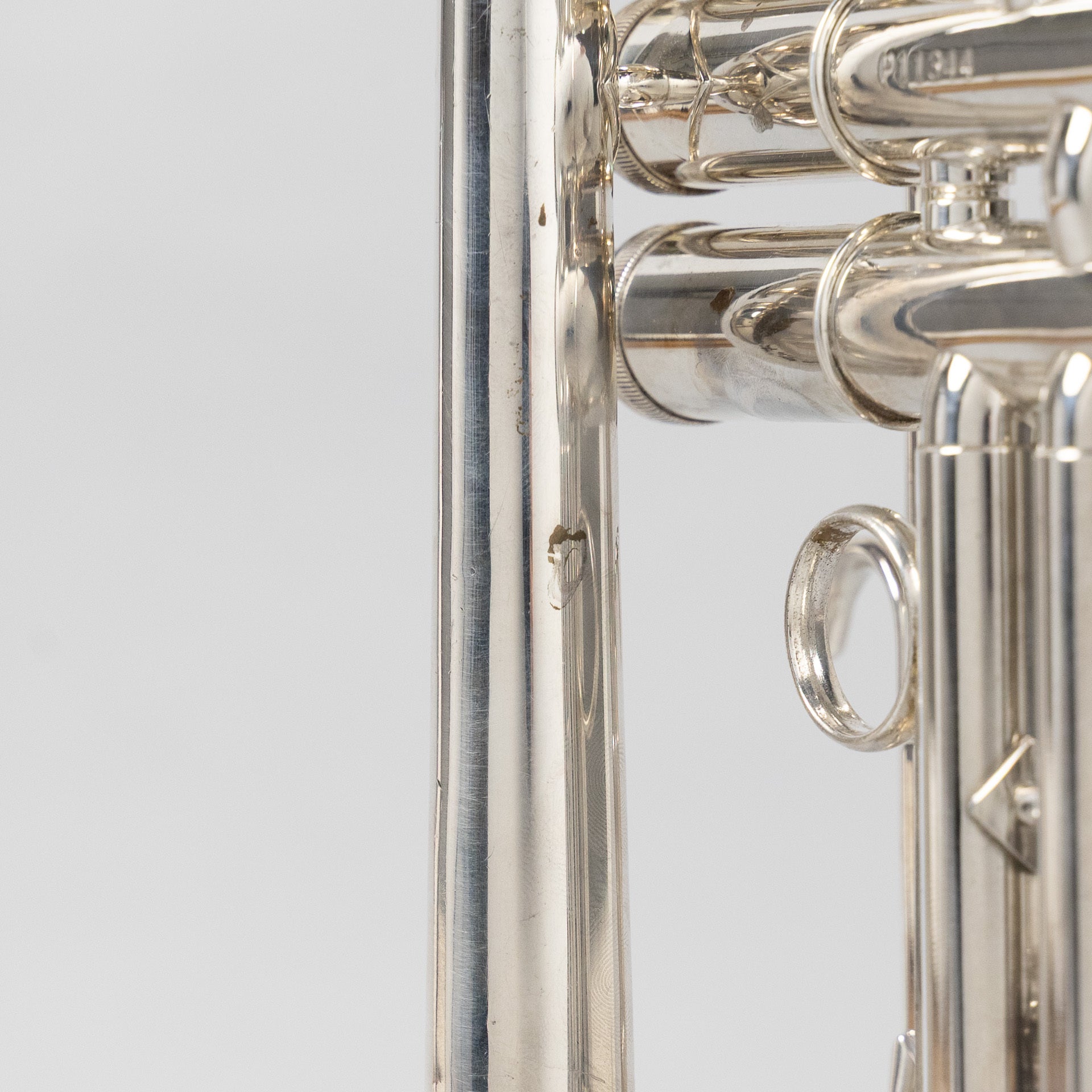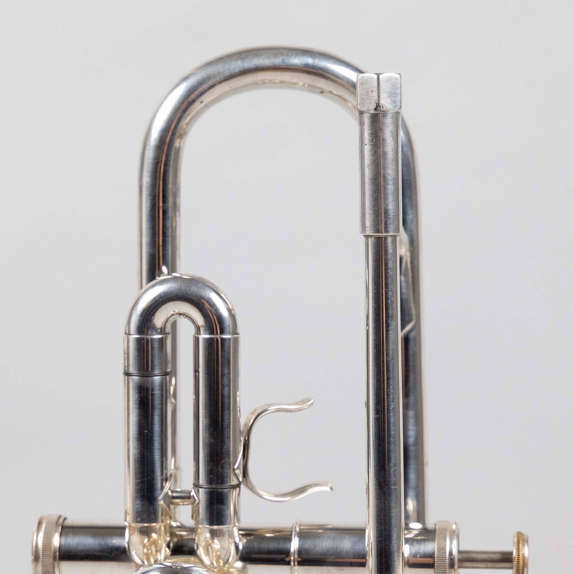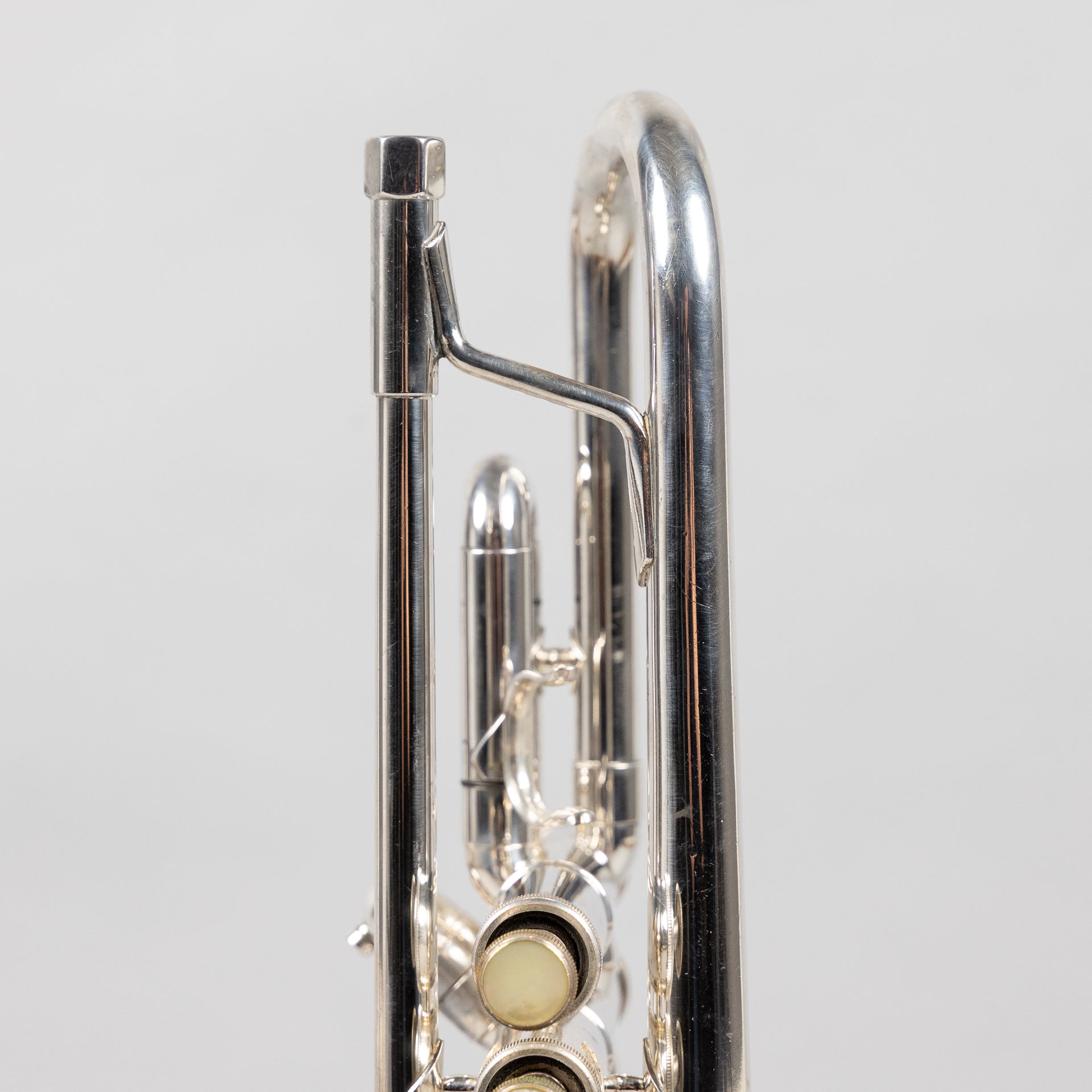 This used Getzen Eterna 700S is in good condition with scratches, tarnish and plating wear in the silver finish. There are no major dents or dings and the valves move freely. The case is in rough shape. Mouthpiece not included.