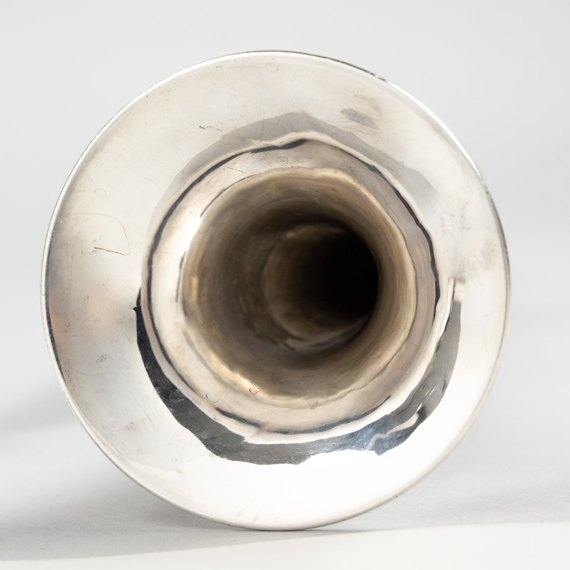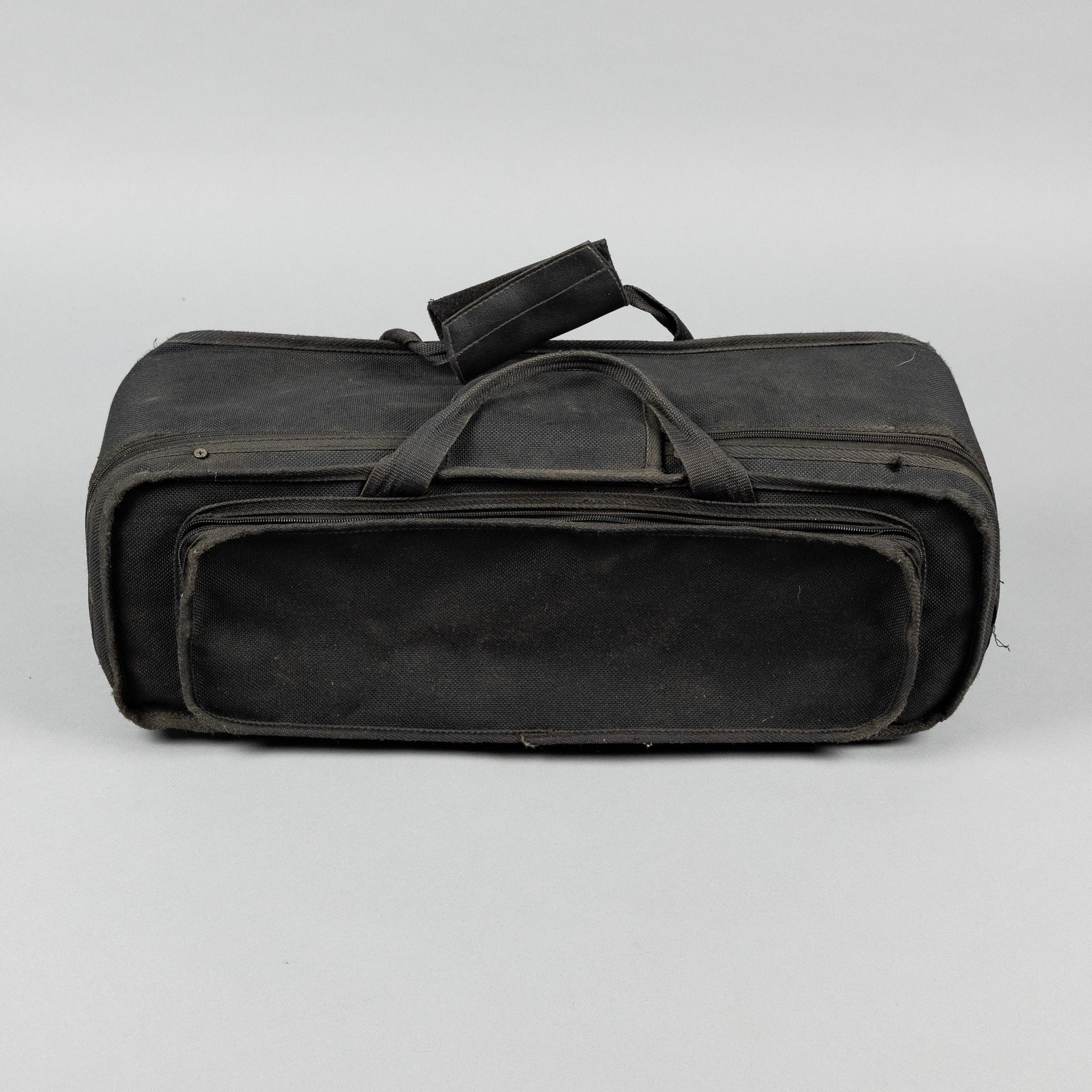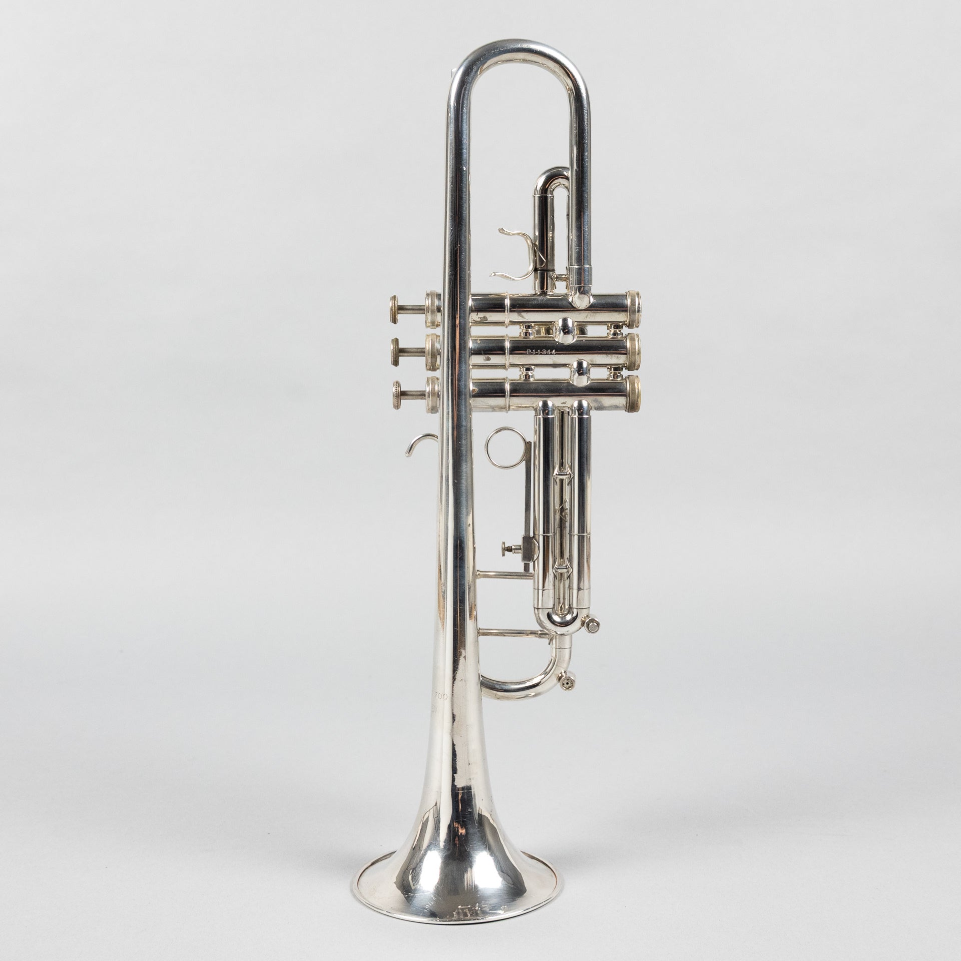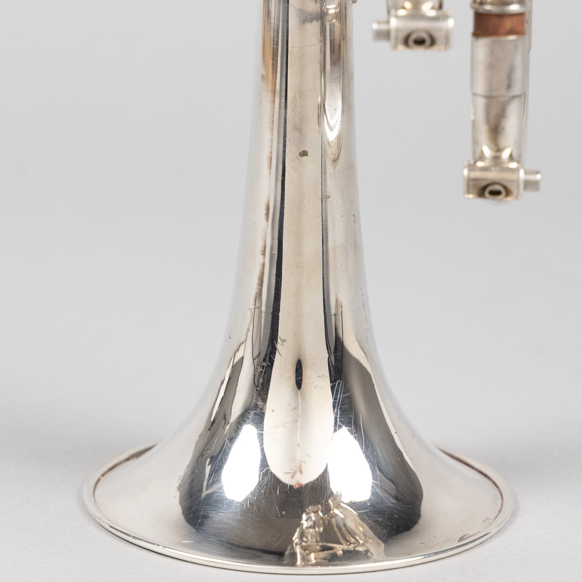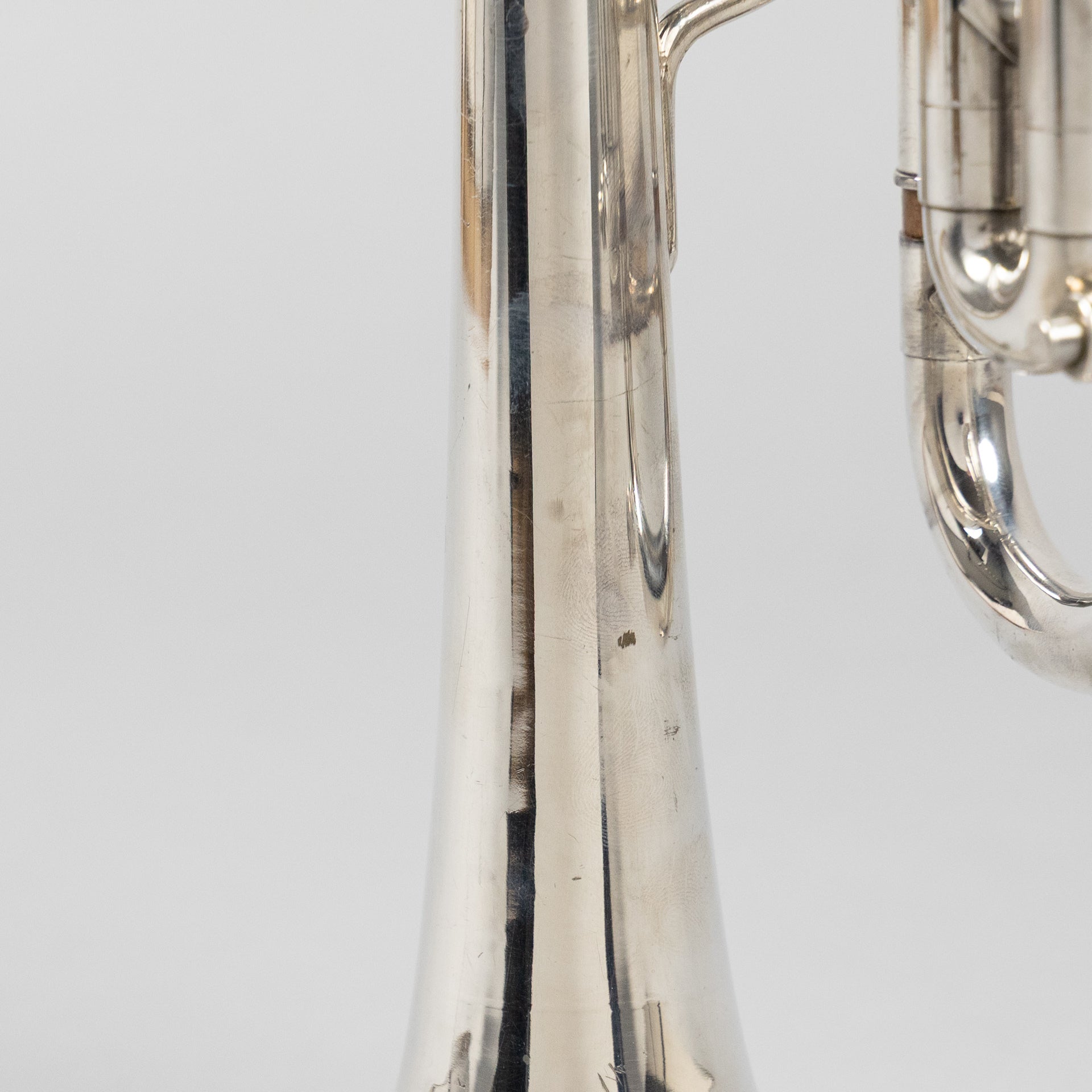This used Getzen Eterna 700S is in good condition with scratches, tarnish and plating wear in the silver finish. There are no major dents or dings and the valves move freely. The case is in rough shape. Mouthpiece not included.