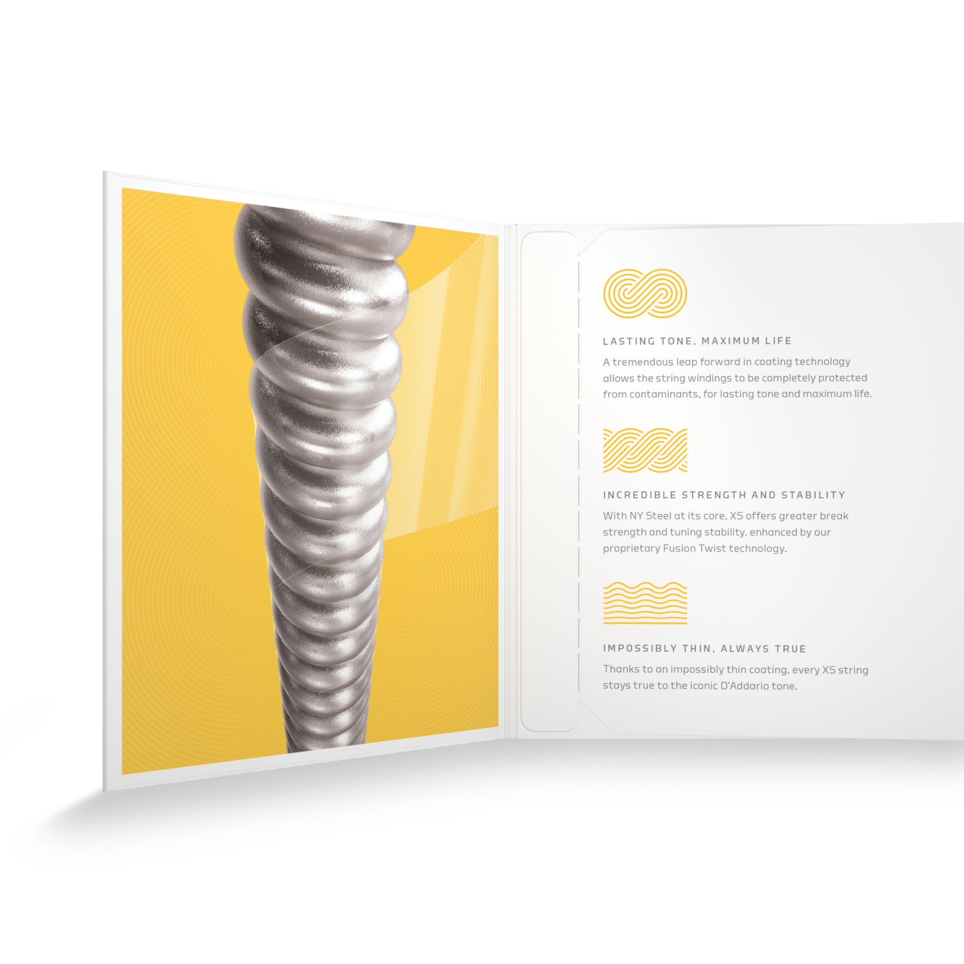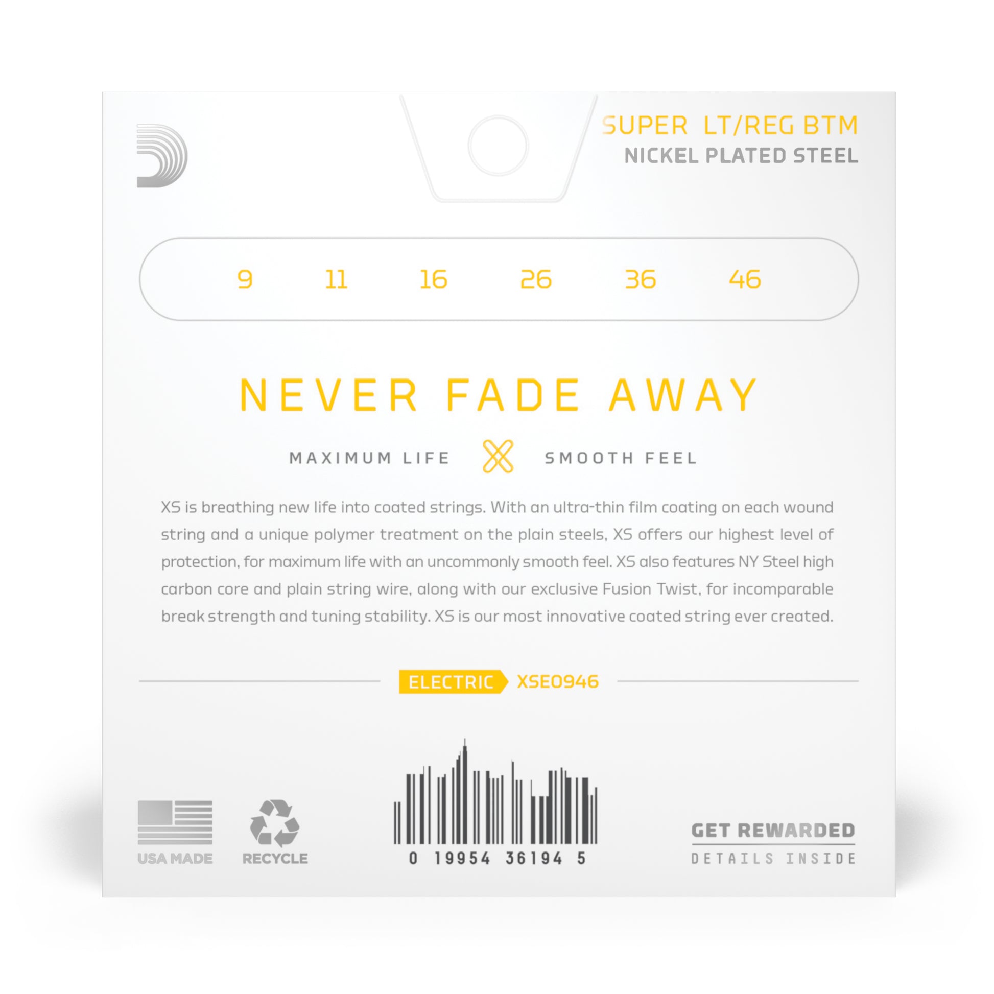 XS Nickel coated electric guitar strings provide the longest life of any D’Addario electric guitar string. Coated with our groundbreaking XS coating, these premium electric strings attain maximum life and a smooth, fast feel without dampening their outstanding tone. Constructed with a NY Steel core, reformulated nickel-plated steel wrap wire, and Fusion Twist technology, XS Nickel strings boast superior strength and tuning stability, plus richer harmonics, greater clarity, and remarkable definition with every sweep, slide, and bend. This 09-46 Super Light Top/Reg Bottom gauge set has more low-end tone than Super Light, while staying flexible for bends.